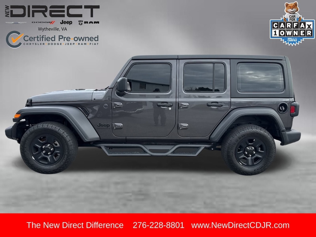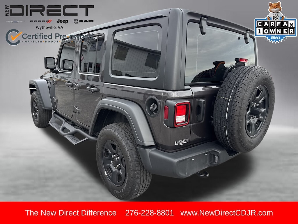 Quick Order Package 22B Sport, FCA US LLC Certified Pre-Owned Certified, 110 MPH Vehicle Max Speed Calibration, 3.45 Overall Top Gear Ratio, 4-Wheel Disc Brakes, 8 Speakers, ABS brakes, Air Conditioning, AM/FM radio: SiriusXM, Apple CarPlay/Android Auto, Aux Battery, Black 3-Piece Hard Top, Brake assist, Cloth Low-Back Bucket Seats, Compass, Delay-off headlights, Driver door bin, Driver vanity mirror, Dual front impact airbags, Dual front side impact airbags, Electronic Stability Control, Freedom Panel Storage Bag, Front anti-roll bar, Front Bucket Seats, Front Center Armrest w/Storage, Front fog lights, Front reading lights, Illuminated entry, Integrated roll-over protection, Low tire pressure warning, Non-Lock Fuel Cap w/o Discriminator, Normal Duty Suspension, Occupant sensing airbag, Outside temperature display, Overhead airbag, Panic alarm, ParkView Rear Back-Up Camera, Passenger door bin, Passenger vanity mirror, Power steering, Power windows, Radio data system, Radio: Uconnect 5 w/12.3" Display, Rear anti-roll bar, Rear reading lights, Rear Window Defroster, Rear Window Wiper/Washer, Remote keyless entry, Speed control, Split folding rear seat, Steering wheel mounted audio controls, Stop-Start Dual Battery System, Tachometer, Telescoping steering wheel, Tilt steering wheel, Traction control, Trip computer, Variably intermittent wipers, and Wheels: 17" x 7.5" Black Steel Styled.